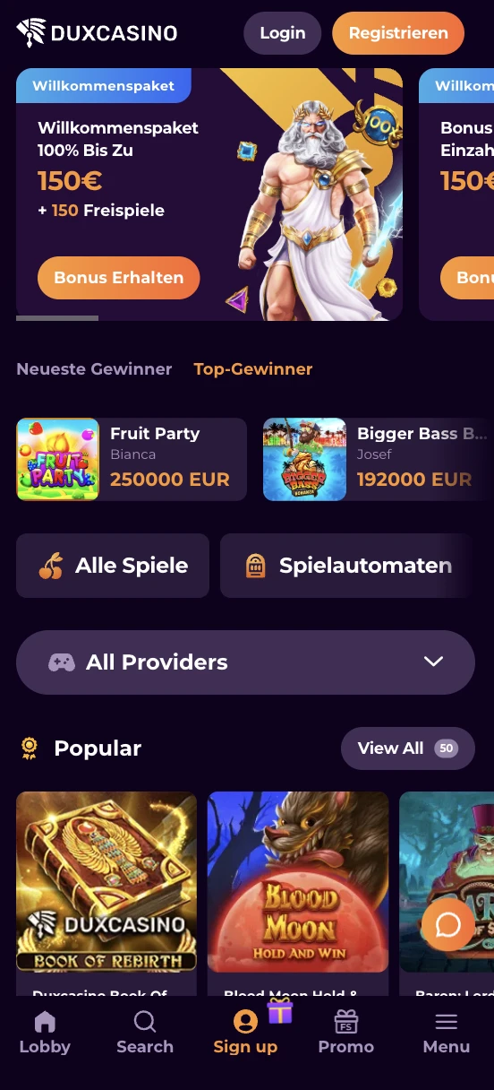 Onze mobiele lay-out is gemaakt voor snel browsen en duidelijke keuzes. Het hoofdmenu houdt games, promoties, support en de kassa binnen handbereik, zodat je niet hoeft te zoomen of naar links hoeft te zoeken. Als je al weet wat je wilt, kun je op naam zoeken of filteren op provider om studio’s te vinden zoals NetEnt, Play’n GO, Pragmatic Play, Yggdrasil Gaming, Games Global en meer. Veel spelers beginnen met Duxcasino slots, waar je in dezelfde lobby ook jackpotgames en nieuwe releases vindt.